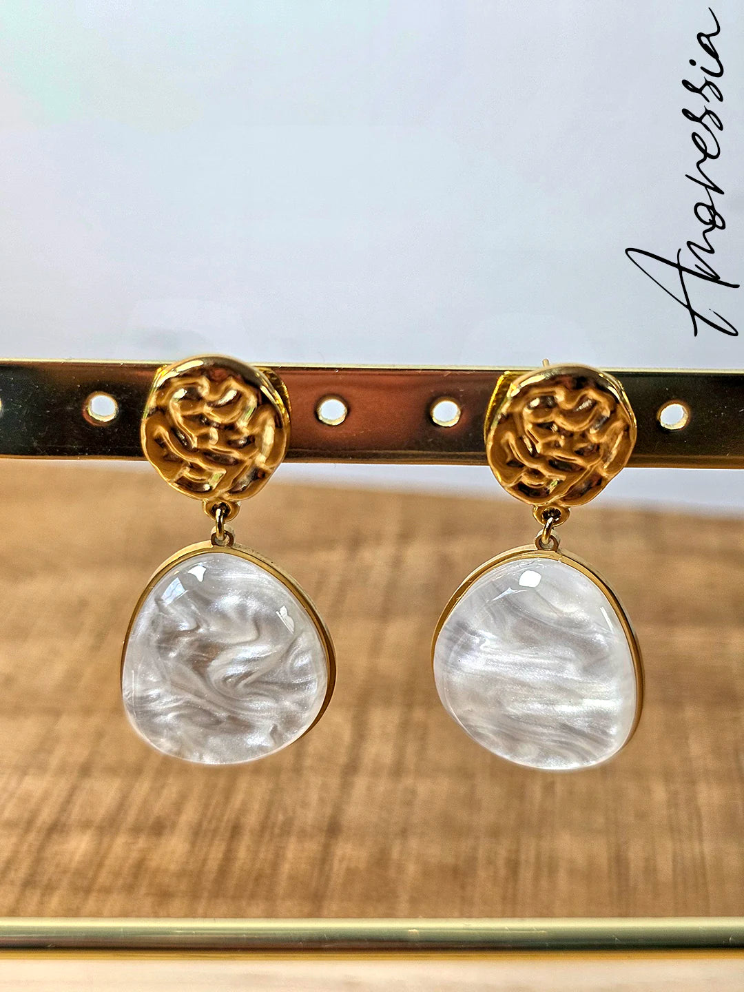 Apportez une touche chic et lumineuse à votre tenue avec ces boucles d’oreilles pendantes dorées au finition martelée, sublimées par un détail en résine blanche. Leur design élégant capte la lumière et apporte du caractère tout en restant féminin et raffiné.