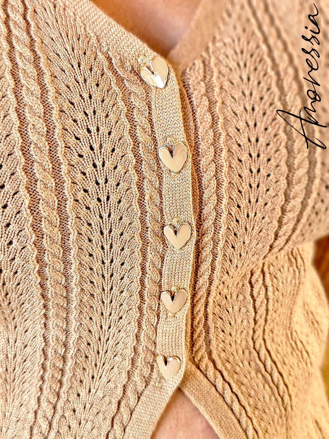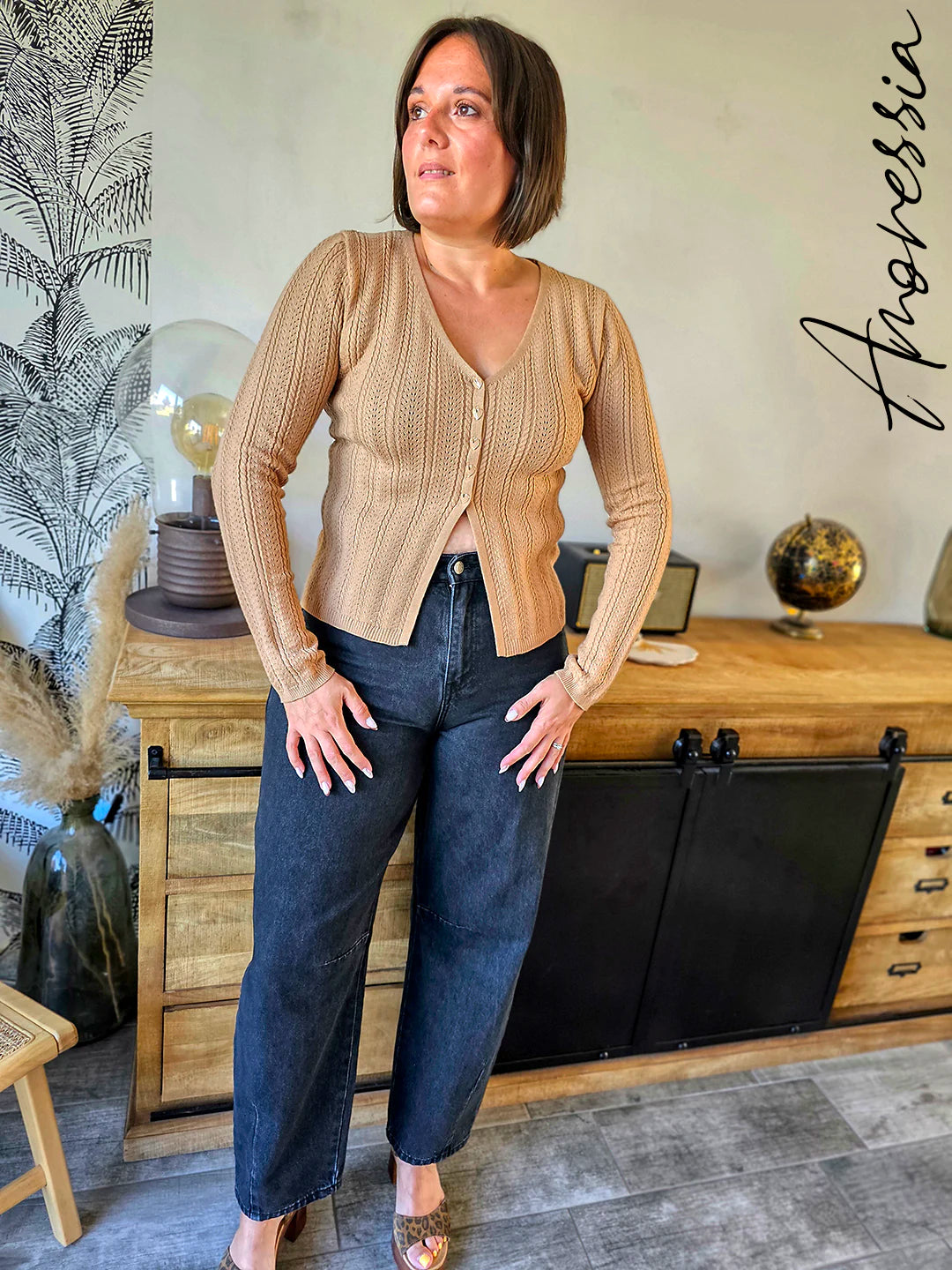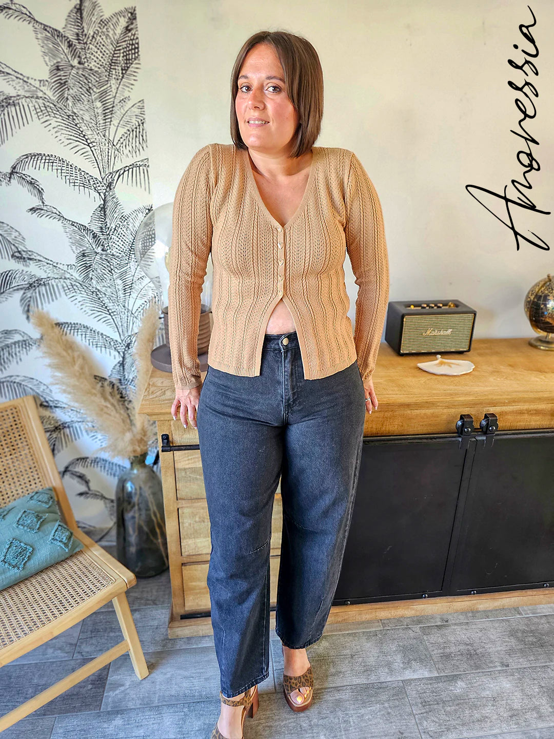 Apportez une touche romantique et chic à vos looks avec ce gilet taupe col V. Sa fermeture à mi-ventre le rend moderne et féminin, tandis que ses 5 petits boutons dorés en forme de cœur apportent une note raffinée et délicate. Conçu en viscose, polyamide et polyester, il allie douceur, confort et tenue parfaite.