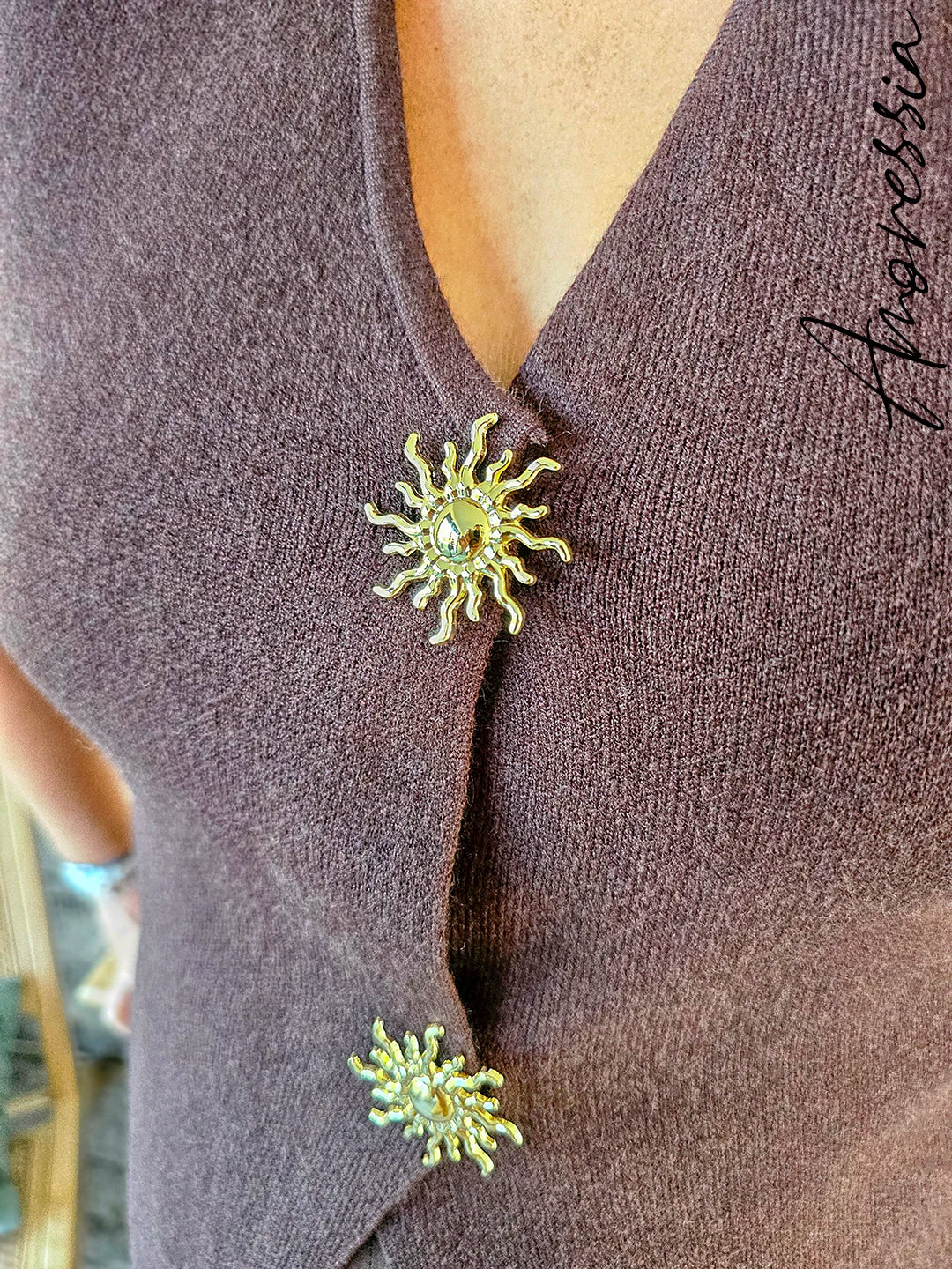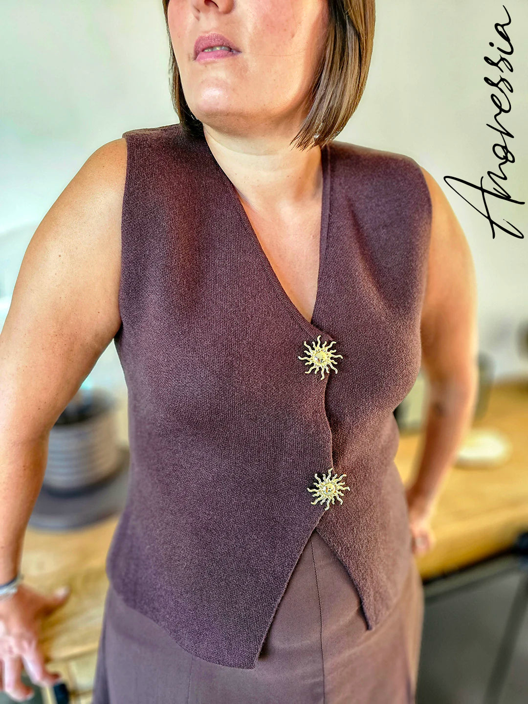 Ce gilet marron sans manches se distingue par son col V élégant et ses 2 boutons décoratifs en forme de soleil doré qui ajoutent une touche raffinée à vos tenues. Sa composition 50% viscose, 35% polyamide et 15% laine lui confère douceur, confort et tenue parfaite. Polyvalent, il peut se porter sur un chemisier, un t-shirt ou même une robe légère pour un style sophistiqué.