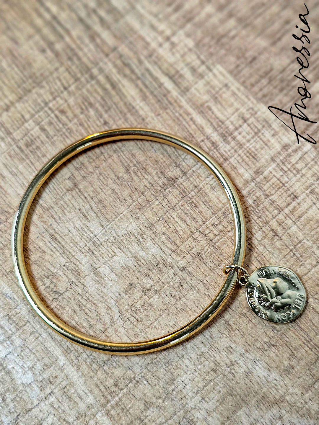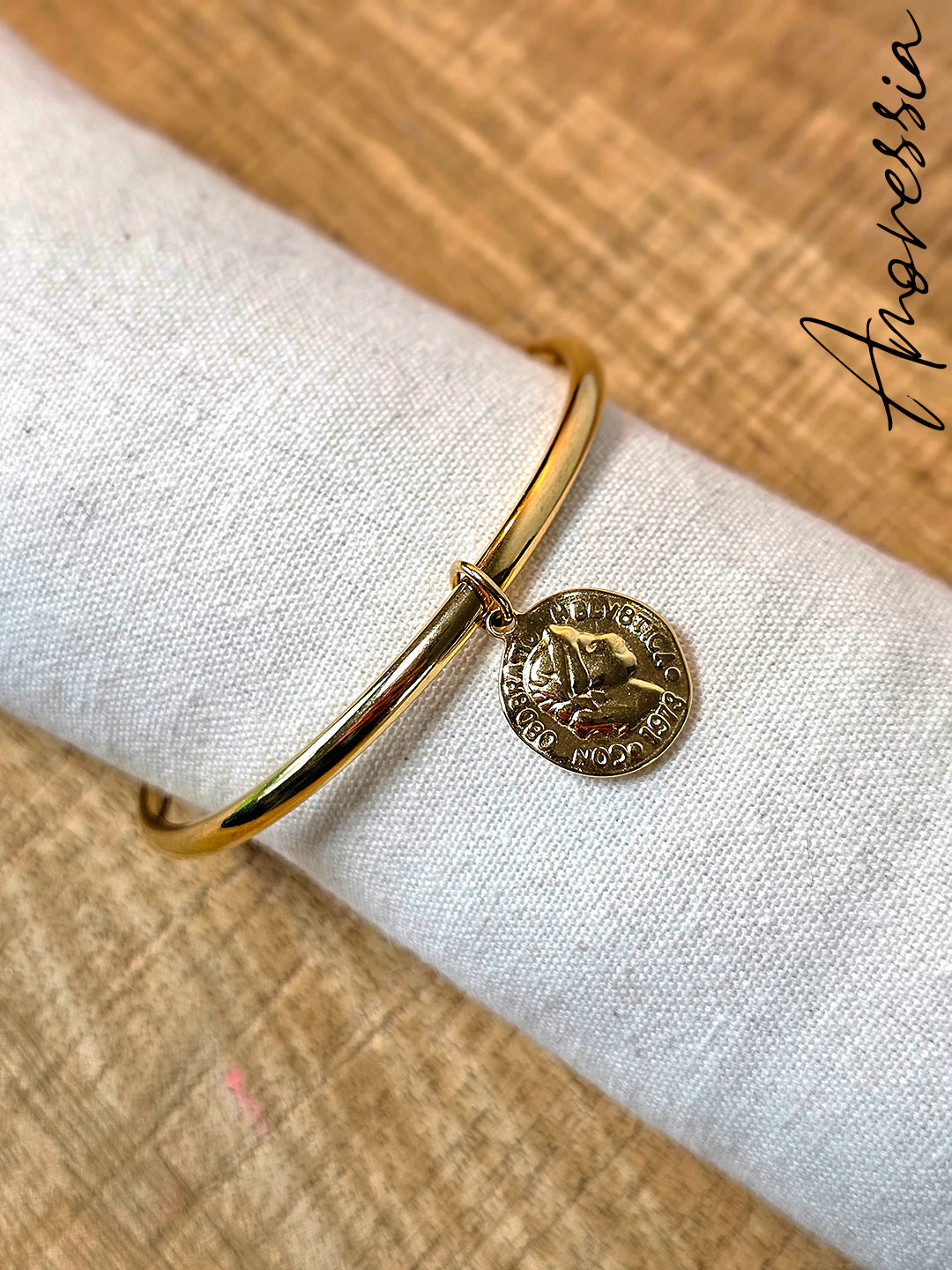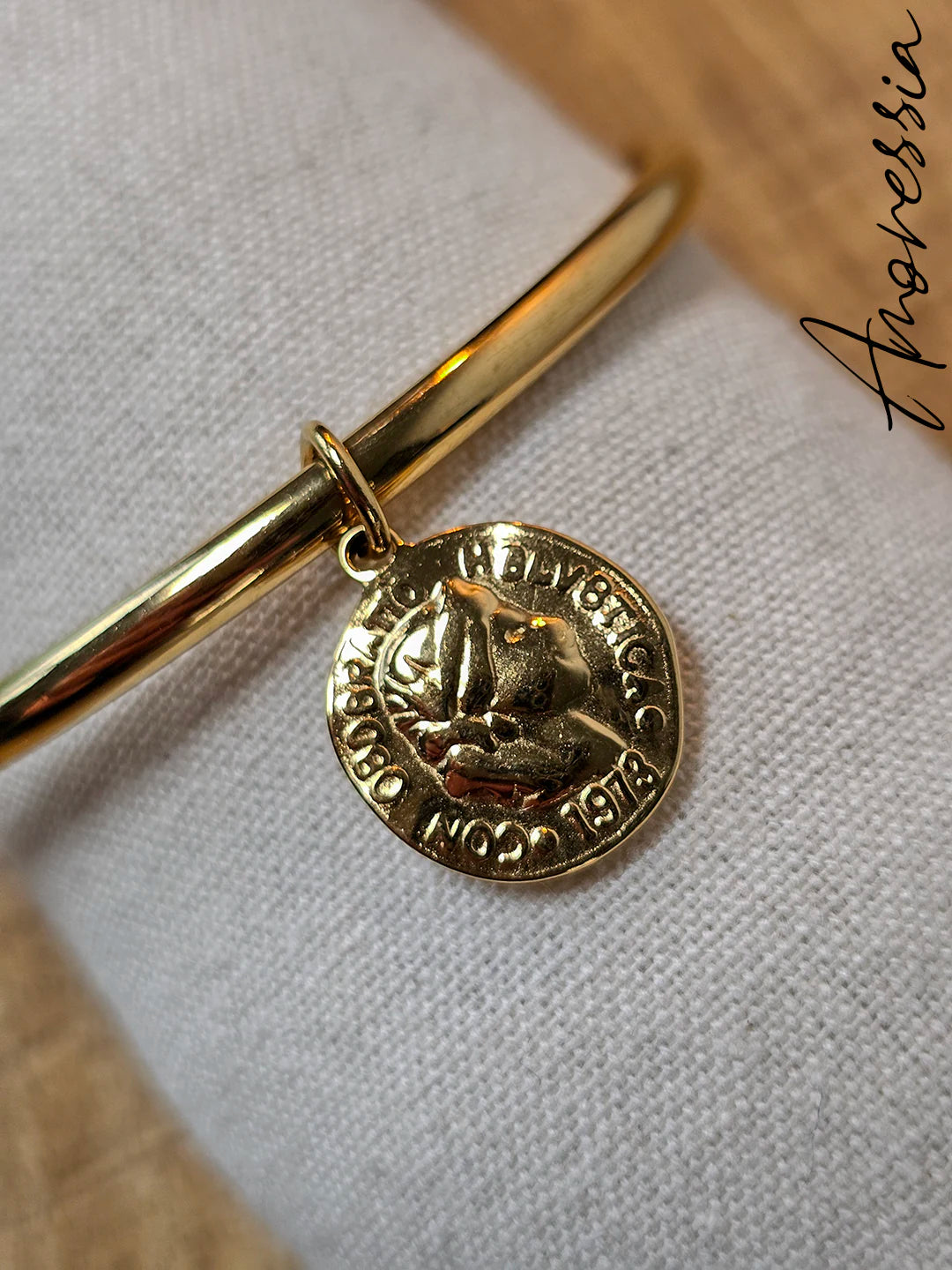 Ajoutez une touche vintage et élégante à votre poignet avec ce jonc doré sublimé par une breloque pièce de monnaie ancienne. Inspiré des bijoux rétro, il apporte du caractère à vos tenues tout en restant facile à porter au quotidien.