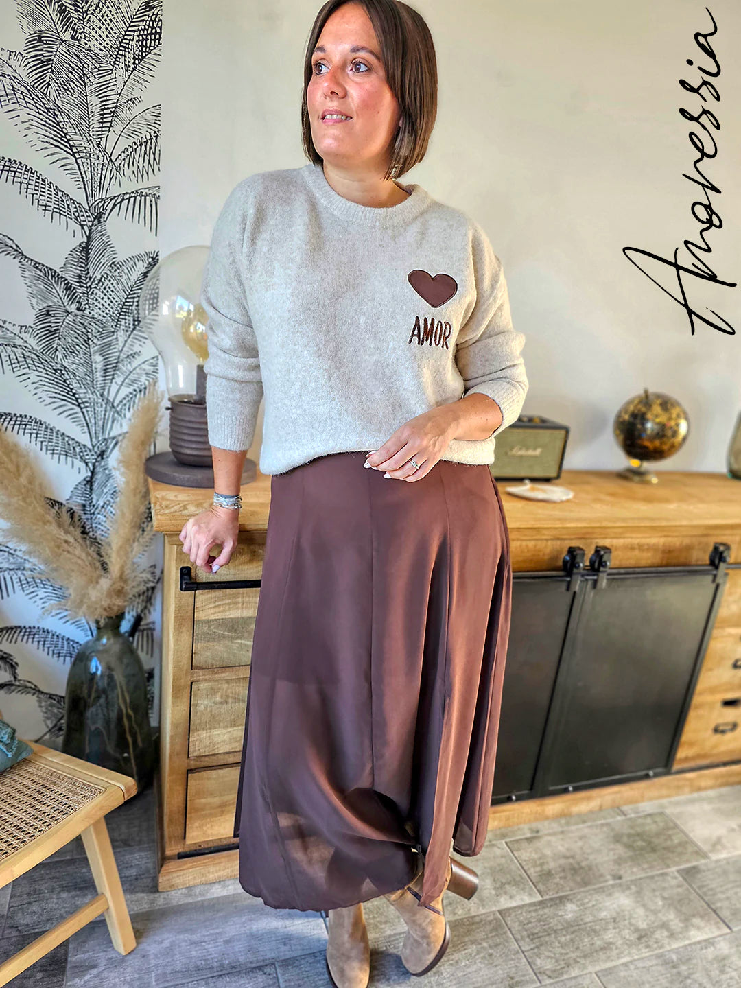 Ce pull beige se distingue par ses détails romantiques : un cœur et l’inscription “Amor” en marron, qui apportent une touche originale et féminine à vos tenues.