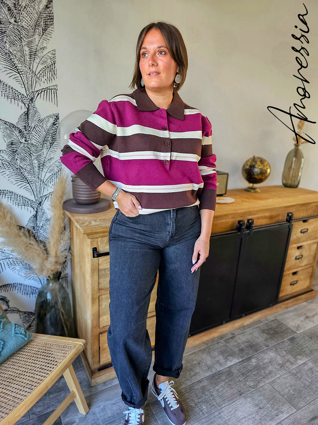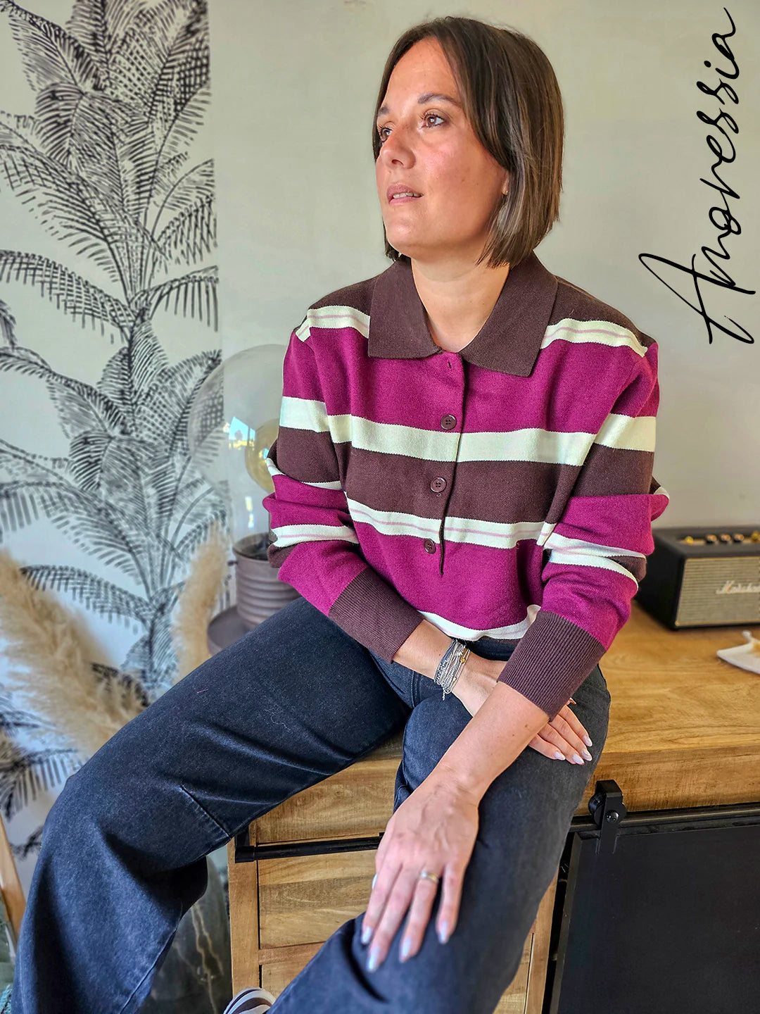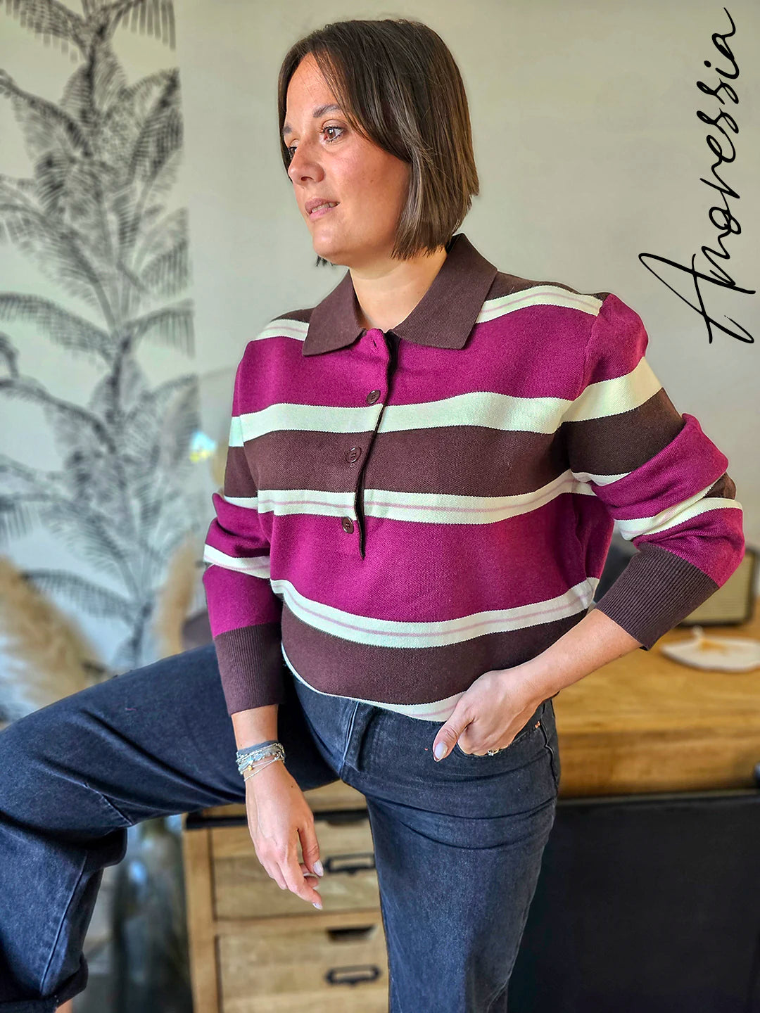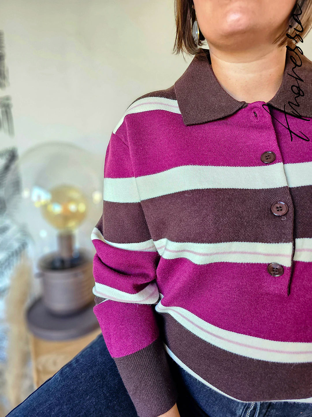 Adoptez une allure tendance et confortable avec ce pull polo manches longues. Son design à rayures tricolores (blanc, bordeaux et marron) apporte de la modernité, tandis que son col polo boutonné de 4 boutons lui donne une touche chic et sportive à la fois. Doux et agréable à porter, il est idéal pour la mi-saison comme pour l’hiver.